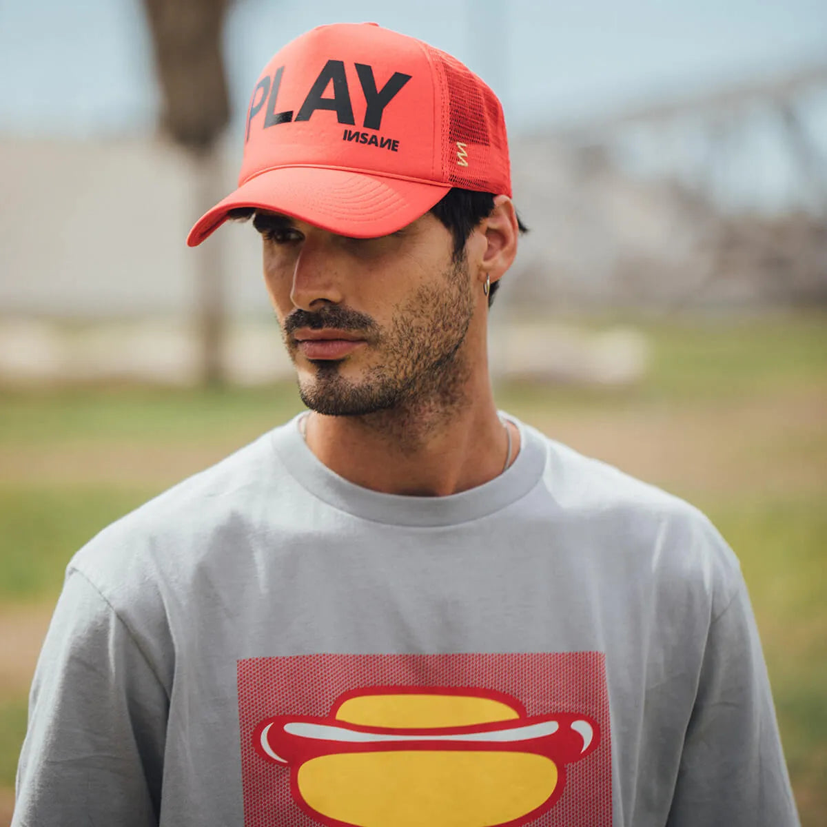 PLAY TRUCKER CORAL & BLACK cap. Enjoy the INSANE experience with our Trucker Foam collection: choose the color of your INSANE cap that best suits your daily outfit. Pick the word that defines your own style and make the ordinary extraordinary. INSANE is an attitude. Don't leave anyone indifferent.